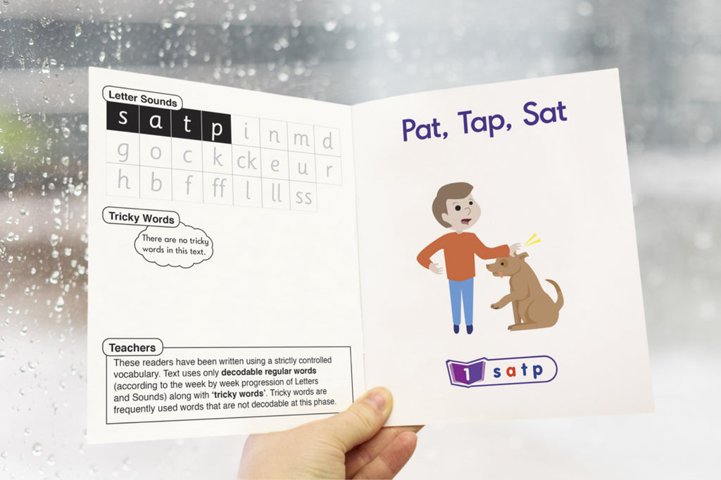 A decodable reading book is a book that only contains phonetics that a child has already learnt. For instance, a child starting out in the earliest stages of reading who has learnt the sounds s / a / t / p, would be able to decode words in a book such as at, sat, tap, and pat. Therefore, the decodable book would only contain these words and would not introduce any unfamiliar letters and sounds.