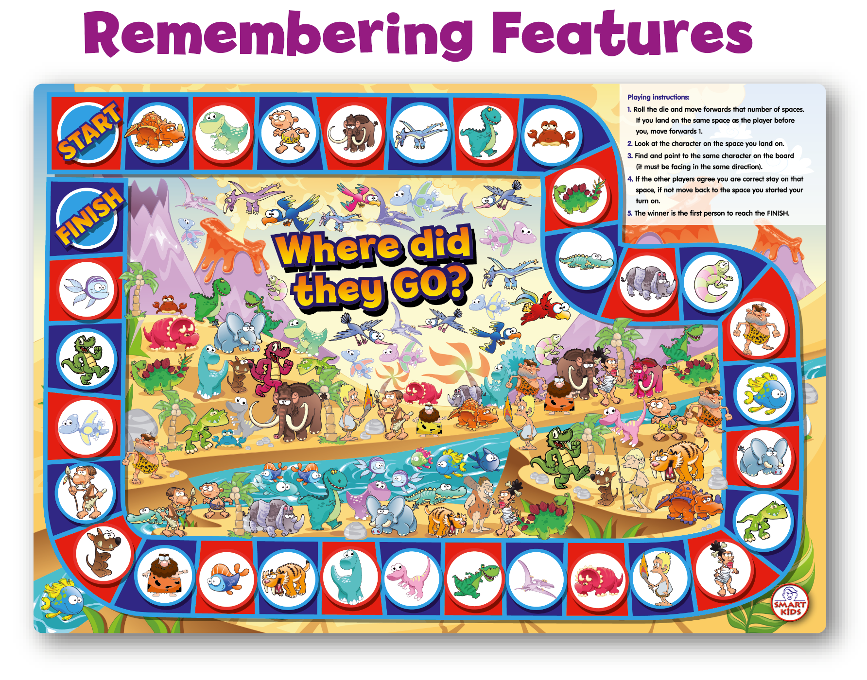 Practise linking techniques for memorising lists; spot picture differences and visually match the same cavemen and dinosaurs to move around exciting game boards.
