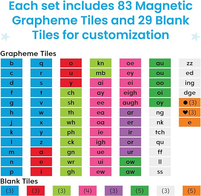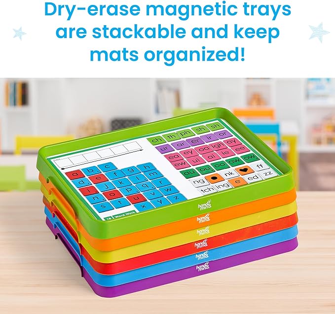 Build, blend, and segment words with these interactive word work sets. Each of the 6 sets comes with a magnetic, dry-erase tray; 112 printed and blank, letter and sound tiles; and 5 double-sided, write-on/wipe-off mats covering topics from blending to sound matching and more.