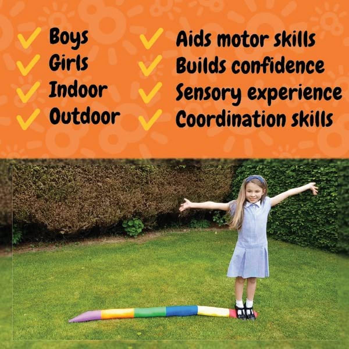 All children love to balance, and this cuddly, soft balancing snake is a safe and fun way to do so. Children can start to gently edge their way along whilst avoiding touching the ground. Taking larger steps from one colour to the next without stepping on the join without overbalancing will test their skills further. The textured filling offers an additional sensory experience on bare feet. Balancing and moving at the same time will help develop children’s competence and confidence whilst having fun.