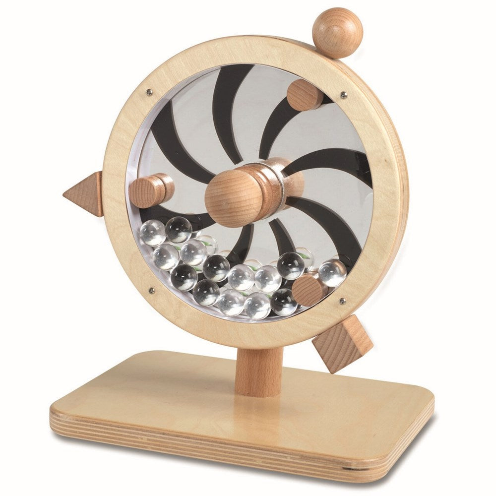 Enchantingly, as you gently turn the wooden wheel, a lively cascade of weighty bubbles joyfully dances and frolics within, creating a delightful, rhythmic symphony of movement and sound. It's as if a secret world of whimsical bubbles comes alive, engaging in a joyful ballet with every turn. The wooden base adds a touch of natural elegance to this captivating spectacle, making it not only a sensory delight but also an aesthetically pleasing addition to any setting.