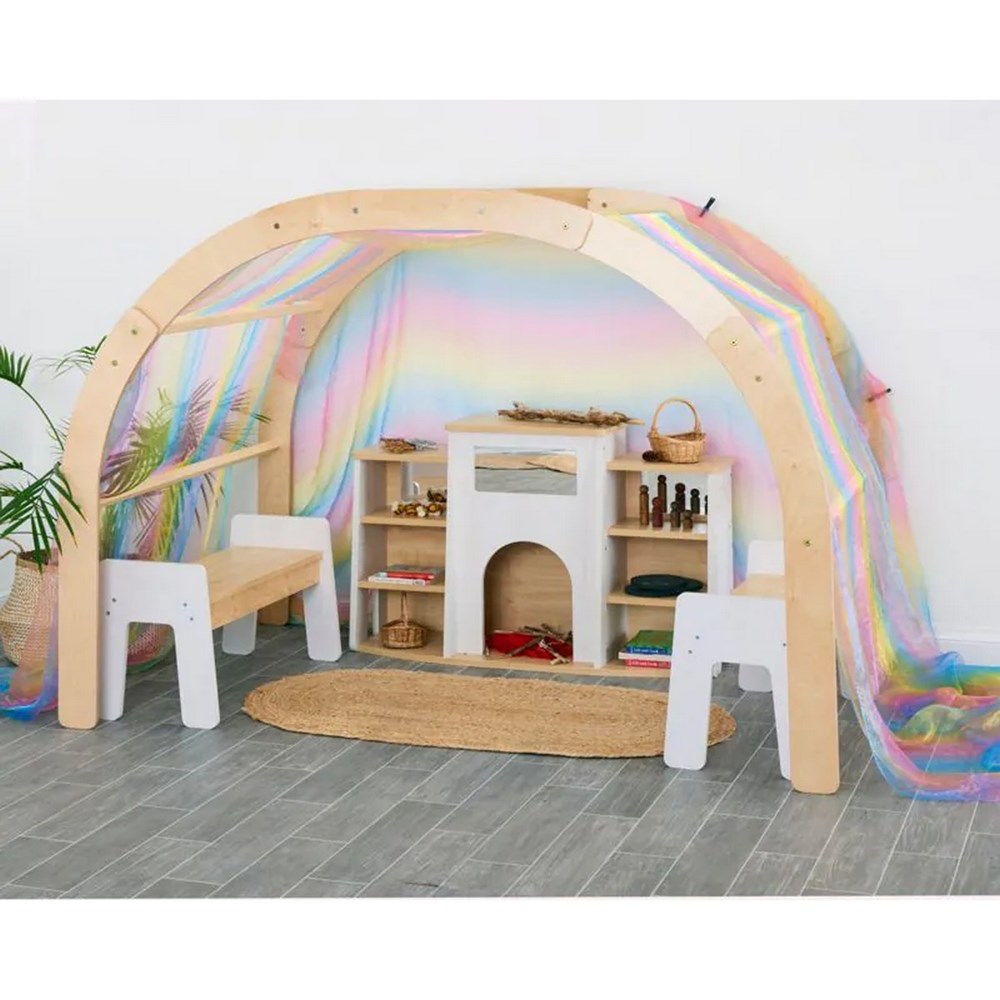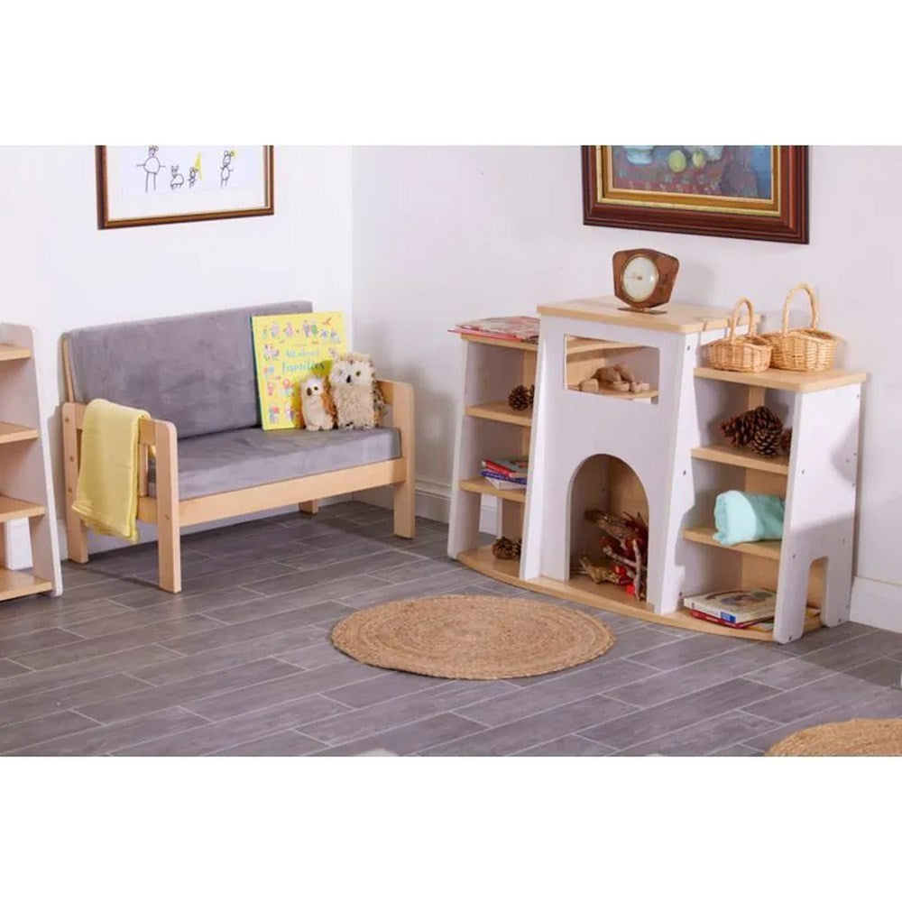 At its centre is an open 'fireplace' where children can engage in role play, using sticks or colourful fabrics to create their own fire. Flanking the fireplace are four generous shelves, ideal for storing and displaying resources, props, or toys, making the unit both functional and visually appealing in any classroom or role play area.