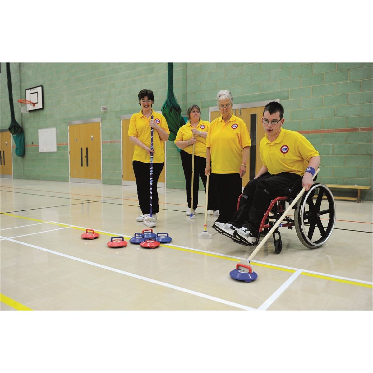 This Curling Game is suitable for both able bodied and disabled people. It can be played individually (each player using 4 stones) or as a team of two players using two stones each. This set includes 4 red and 4 blue Curling stones and a carrying bag. The Curling stones are made from plastic compound and contain 3 steel bearings in the housings underneath this enables the Curling stones to run over smooth flooring. Each stone is 130g – 18cm wide – 8cm high including handle. Bag size 42cm x 37cm. Total weight: 10,50kg.