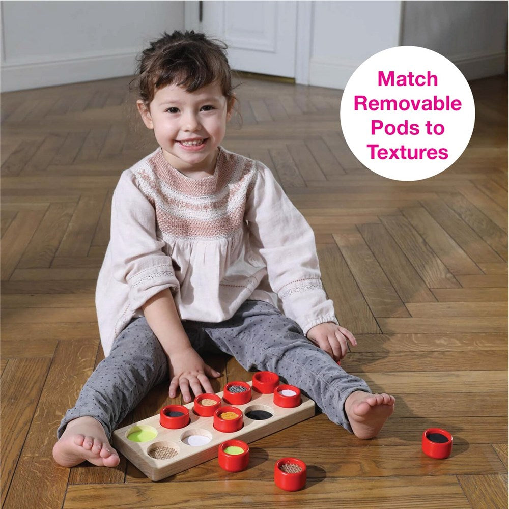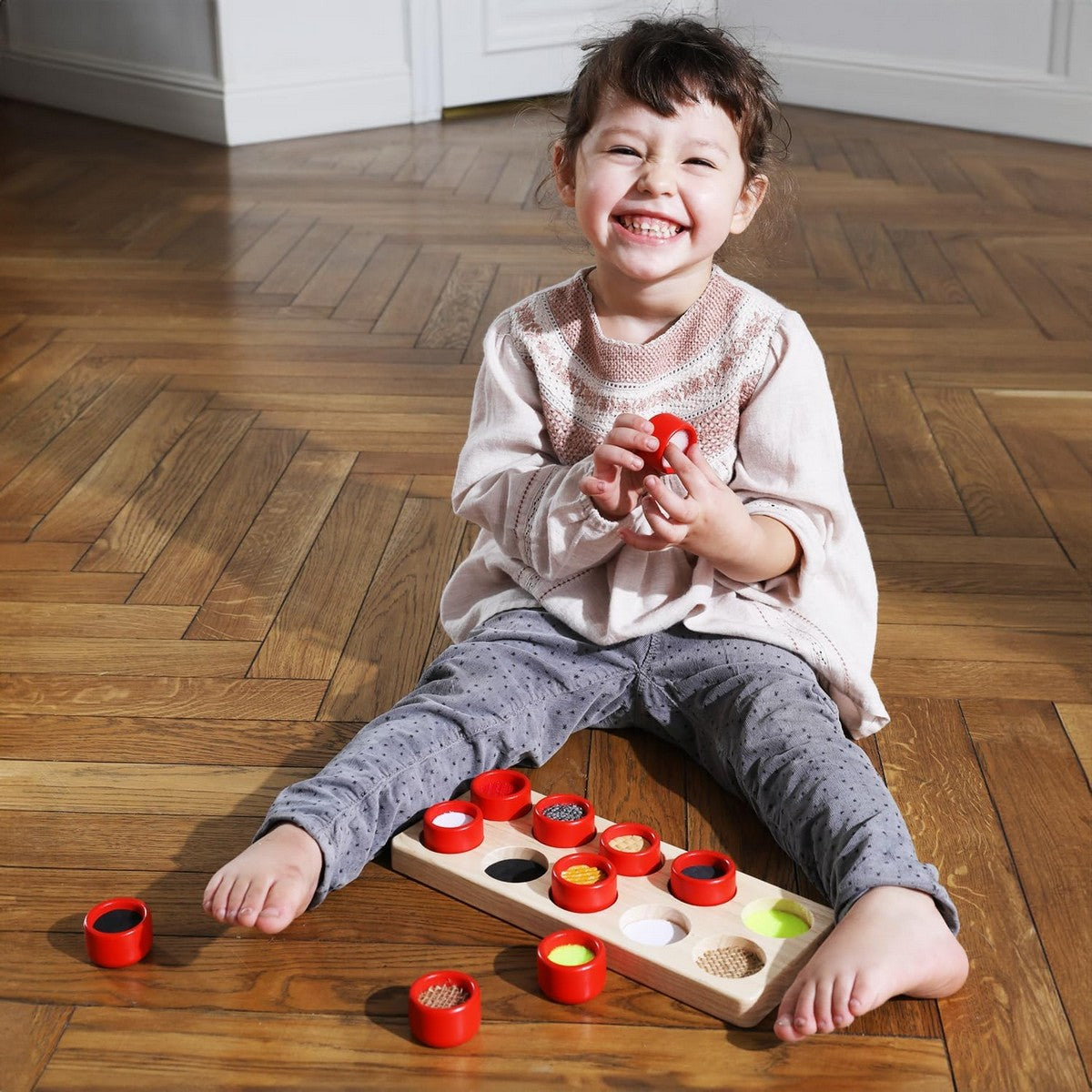 Identifying and remembering textures is an important part of sensory learning. In this original game, children touch and name the colors and textures of the disks and then find the matching disk.