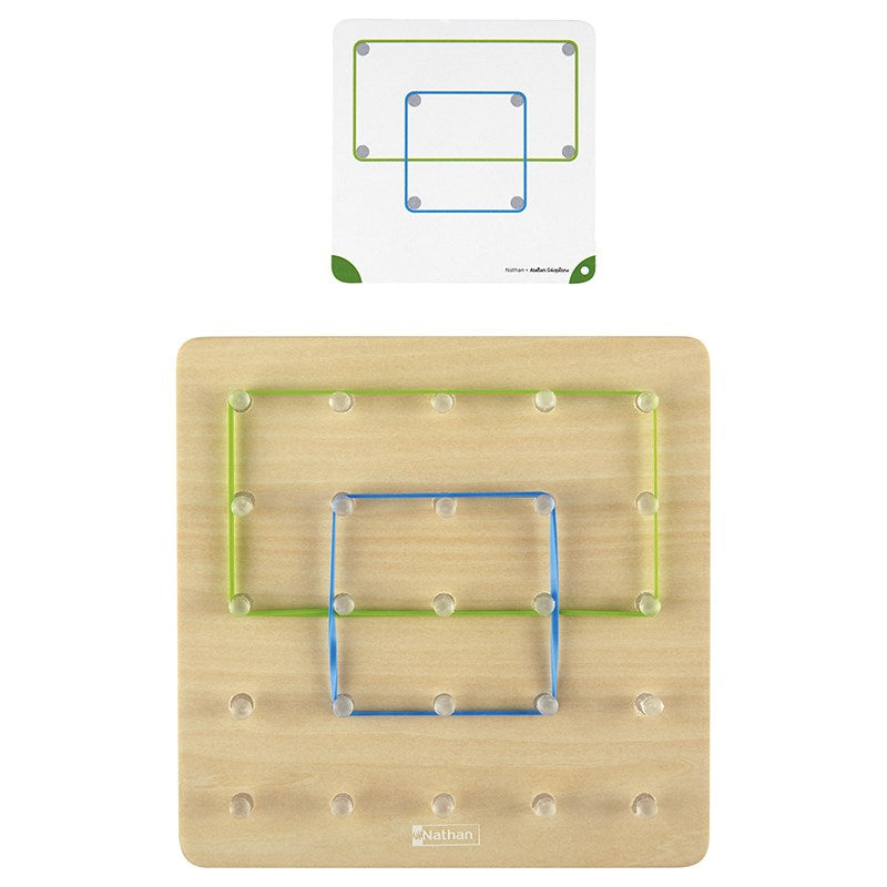 Each child has a Geoboard, elastic bands of different sizes and colors, a perforated activity sheet to place on the wooden base (or next to it), and/or an instruction card.