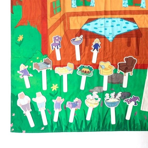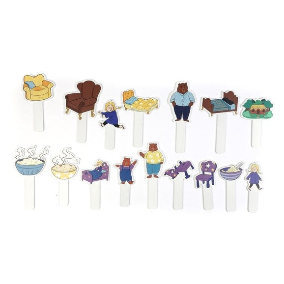 - 16 x wooden paddles depicting story characters and elements (2 x Goldilocks, Daddy Bear, Mummy Bear, Baby Bear, a cottage, 3 x bowls of porridge, 4 x chairs and 3 x beds)