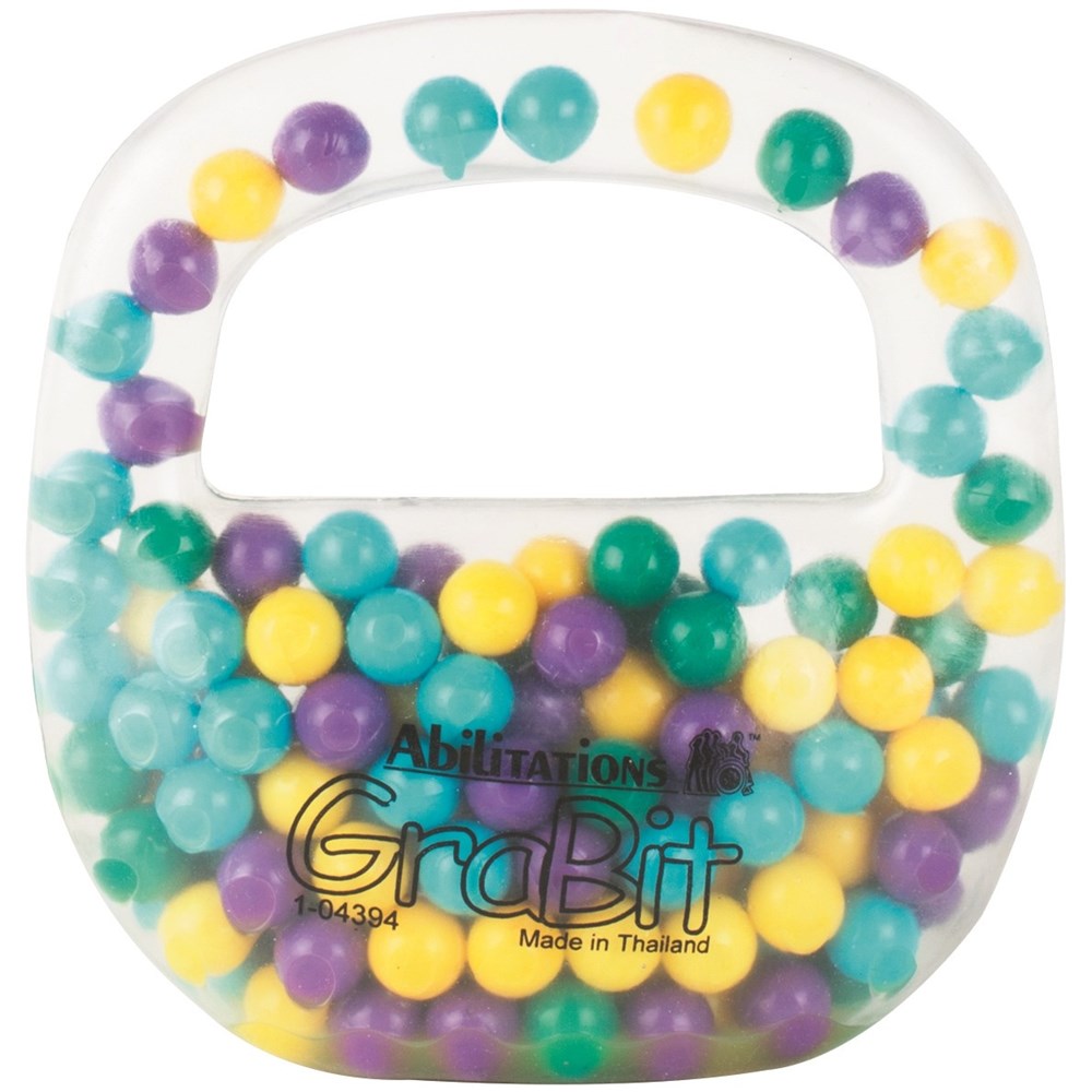 Grabits is a unique tool for grabbing and holding. It has the landing characteristics of a beanbag but is designed to be tossed like a horseshoe. The possibilities created by the flexibility and stretchability of the grip section, as well as the tactile stimulation, are endless. Grabits are filled with small PVC balls that move in a non-toxic gel.