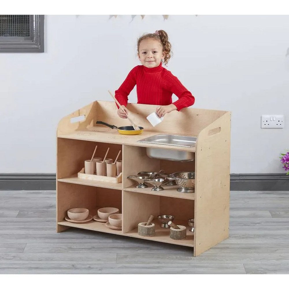 Equipped with a realistic sink and hob, this kitchen is the perfect addition to your home corners or play areas. They'll be flipping imaginary pancakes, simmering pretend soups, and serving up delightful dishes to anyone brave enough to taste test (beware of the imaginary burnt toast!).