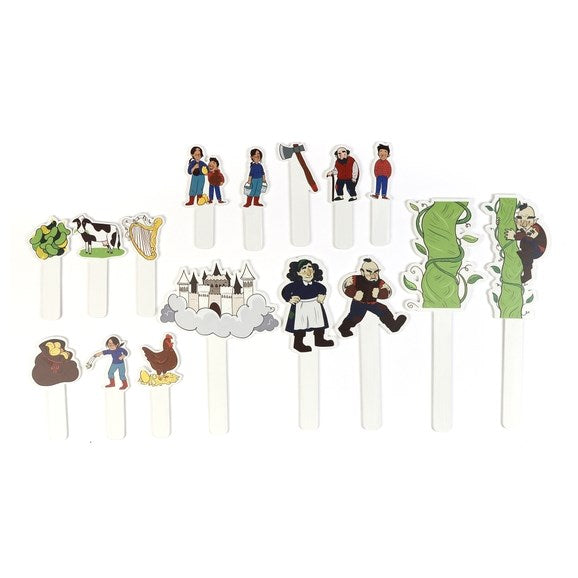 - 16 x wooden paddles depicting story characters and elements (Jack, 2 x Mum, the cow, the old man, the magic beans, the beanstalk, the castle, 2 x the Giant, the Giant’s wife, the golden egg, a golden harp, a bag of gold coins, an axe and a rich Jack and Mum together)