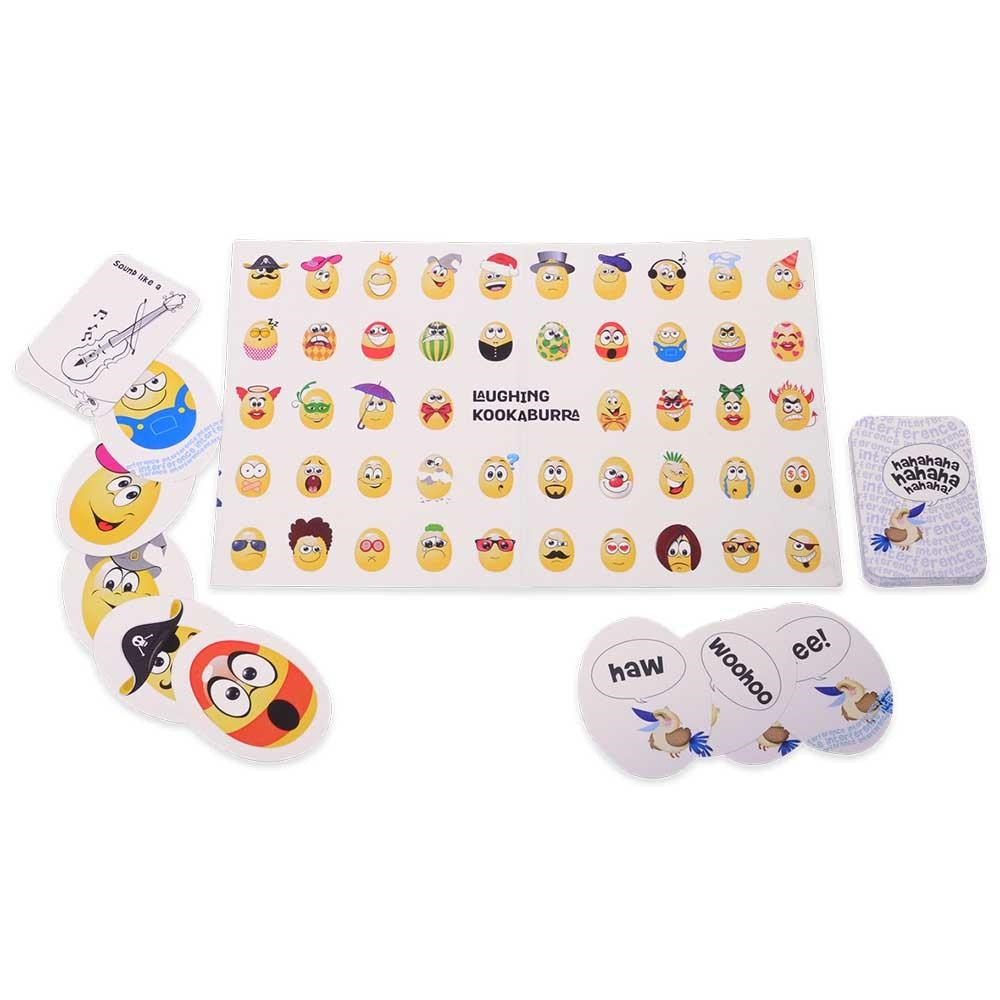 Exercise your memory muscles with Kookaburra’s hysterical laughter and maniacal cackling in 2 creative gameplays! Focus, Observe, Laugh to remember and remember to laugh. Are you confused? Ha Ha Ha! Do you still remember? Ha Ha Ha. Players take turns to draw Kookaburra Eggspression cards & remember an increasing series of Eggspressions by pointing to the Eggspressions on the board. If you draw an “Interference card”, perform the activity in all its seriousness before pointing to the correct sequence of Eggspressions. Get caught pointing out the incorrect sequence, you must collect the cards – the first player to run out of cards wins. Keen observation, memory and focus are a must! For 2 or more players.