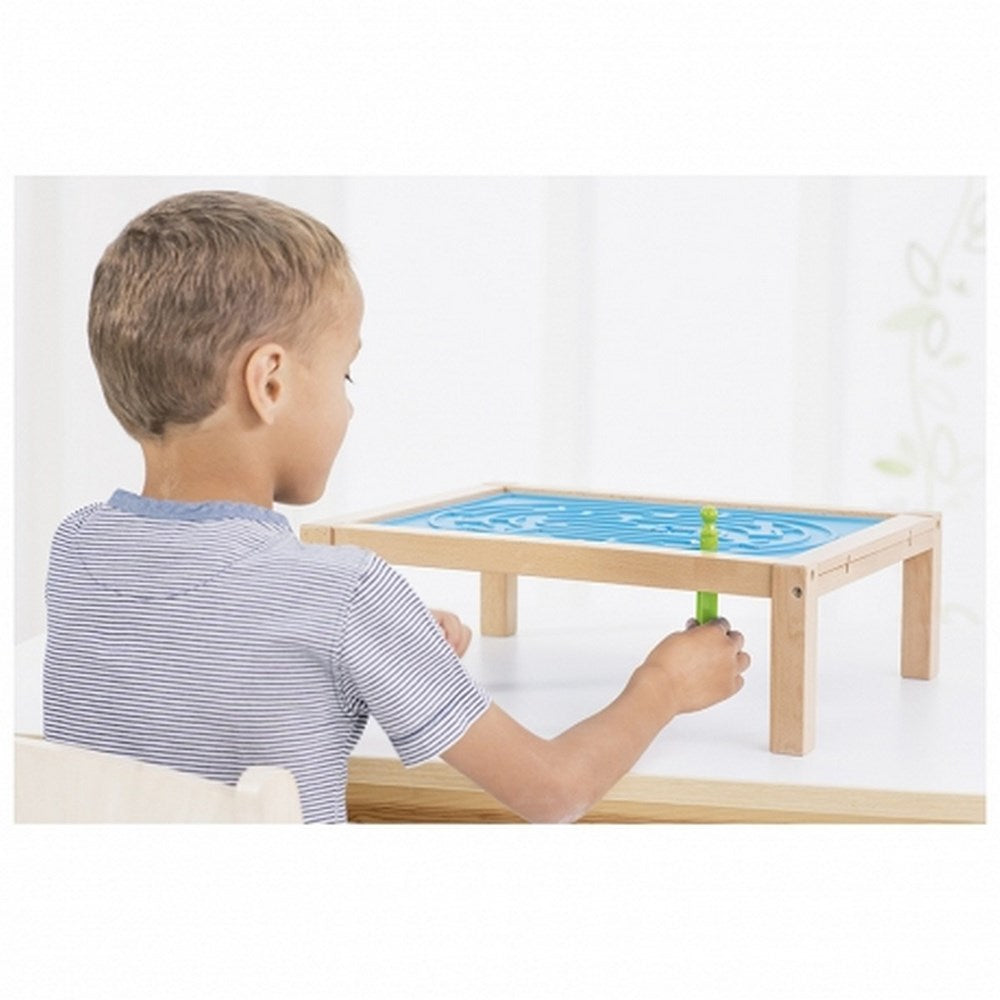This wooden support allows a child to learn with the Magic Tracks. He moves a figurine on a board using a magnetic stick under the board, taking care not to drop it!