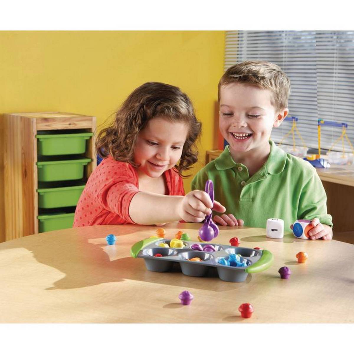 •Children develop fine motor skills as they use Squeezy Tweezers to pick up the muffin counters