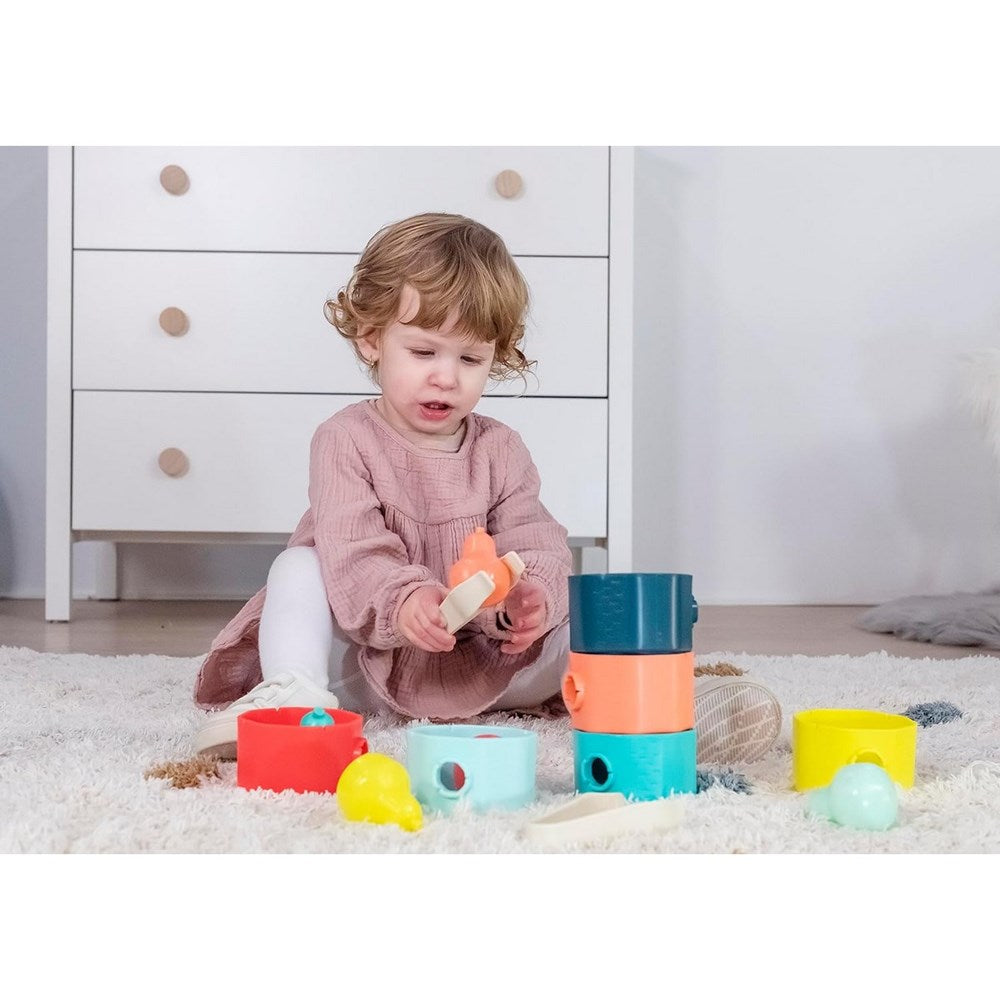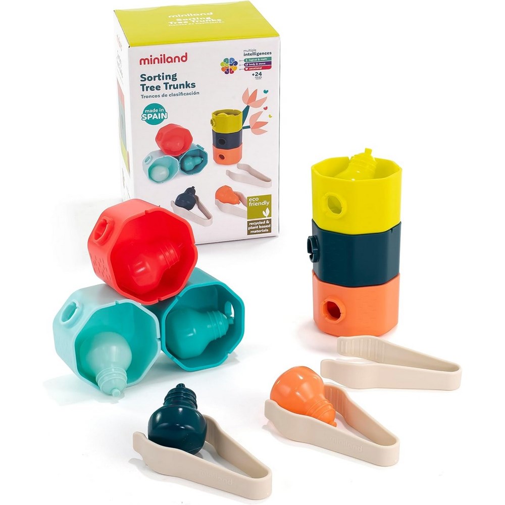 In addition, with this toy the little ones will be able to experience the classification by shapes and colors. The purpose of the game is to put the little fruits inside the logs of the corresponding color and then stack them all in a single tower with the help of the tweezers. The logs can also be arranged in a honeycomb structure and placed sideways to increase the difficulty for older children. What fun!