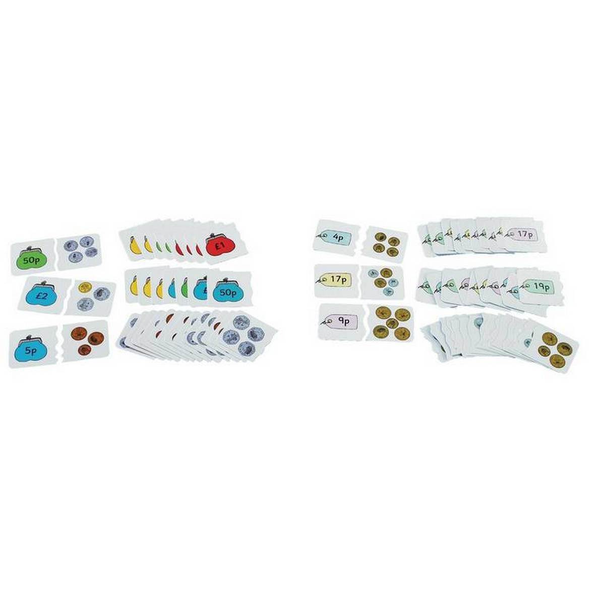 2 boxes of laminated cards with clear visual representations of coins and values. Provides effective practice in recognising coins, adding sums, making simple purchases and giving change. Ideal for independent group work. Box A contains 18 pairs to encourage decomposition of coins in current use. Box B contains 24 pairs to encourage combining coins to make simple amounts (from 4p to 21p).