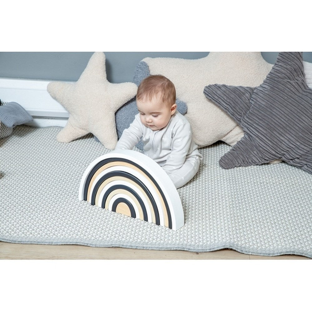 Elevate playtime to a new level of creativity with the Monochrome Wooden Stacking Rainbow from Hope. Crafted from premium wood and elegantly designed in timeless monochrome tones, this stacking toy is a modern twist on a classic favourite. Encourage imaginative play, enhance fine motor skills, and spark a sense of wonder as little ones stack, balance, and build their very own masterpiece. The high-contrast black and white colours can also help as a baby's eyes are developing and learning to focus on the world around them.