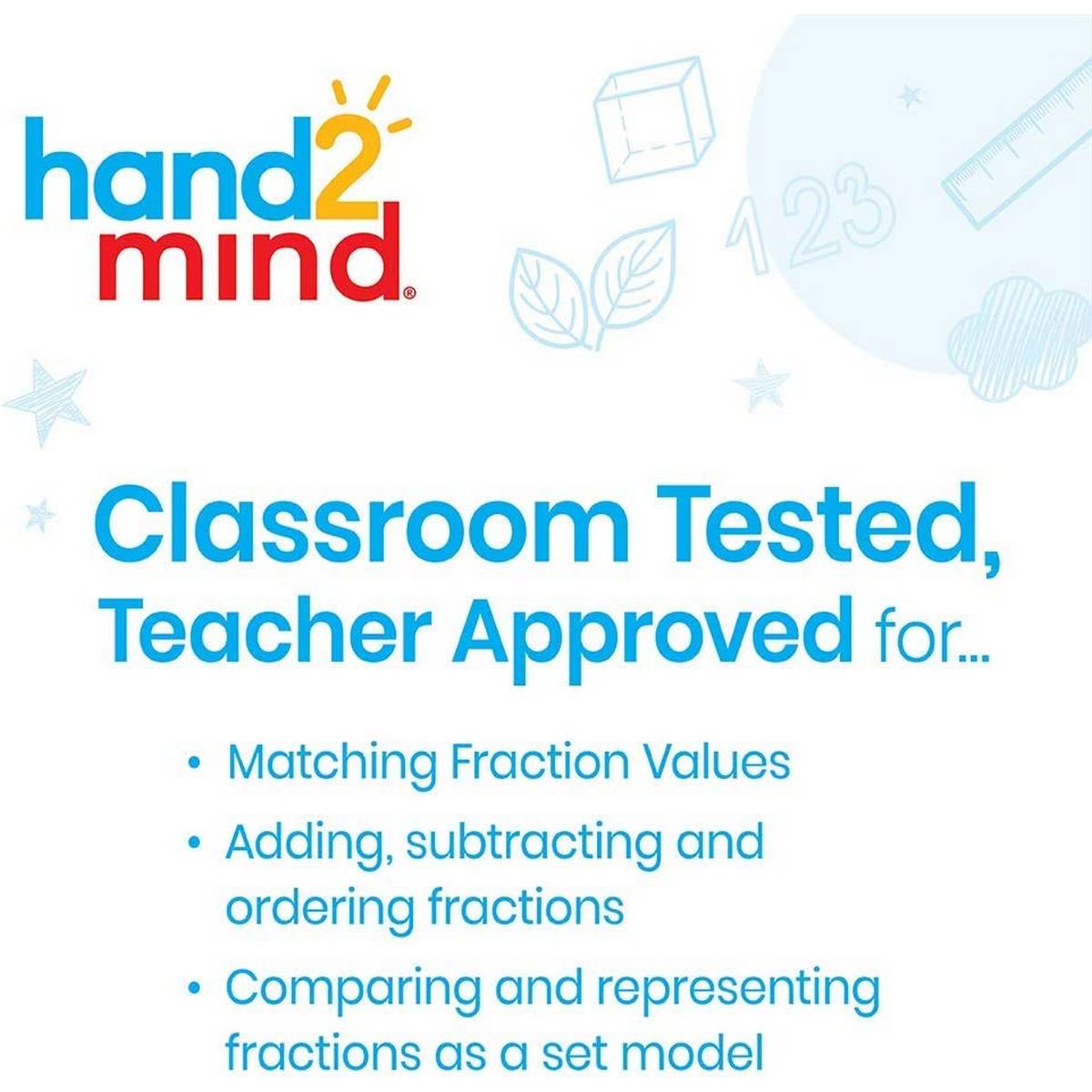 Each sturdy foam die features the same fractions expressed either as a number, an area model, a number line or set model.