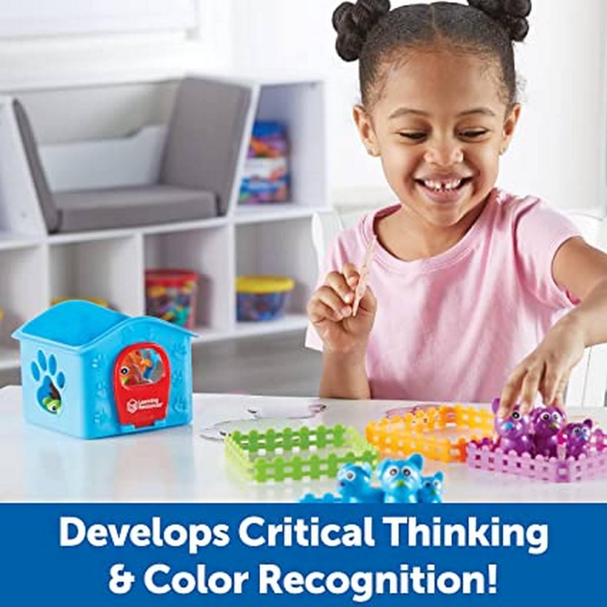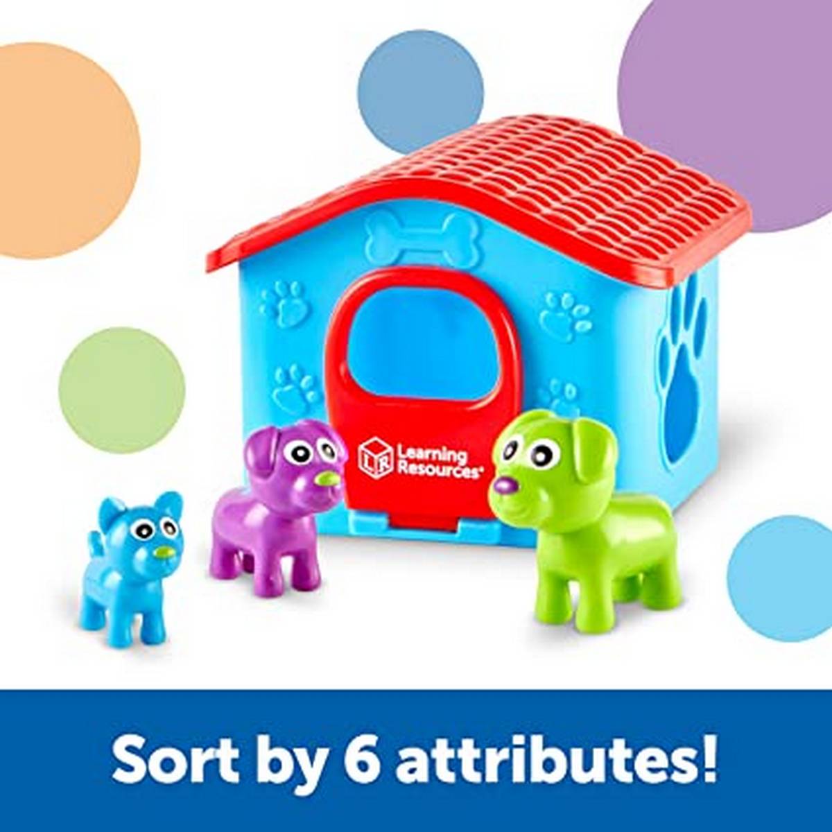 The set includes 12 pups, 4 playpens, numbered pawprint cards, kennel with removable roof, and guide with sorting activities.