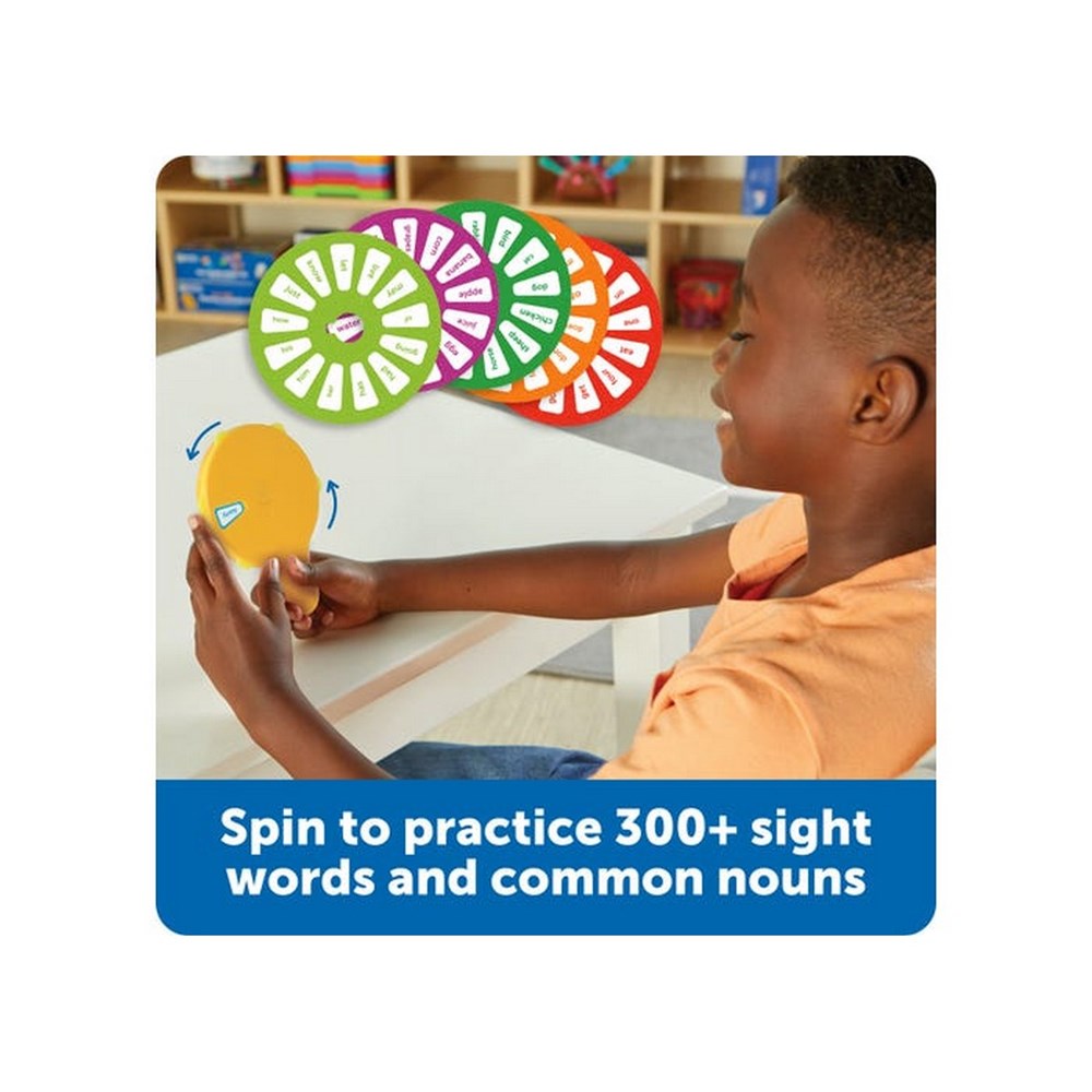Take new language skills for a spin with this handheld learning wheel! Kids can pop in a card, spin to a word, and begin their reading journey. This set includes 14 cards packed with more than 350 Dolch sight words and common nouns—it’s an all-in-one way to practice early reading skills. Cards store on the back of the wheel for easy cleanup and on-the-go learning. Age 5+
