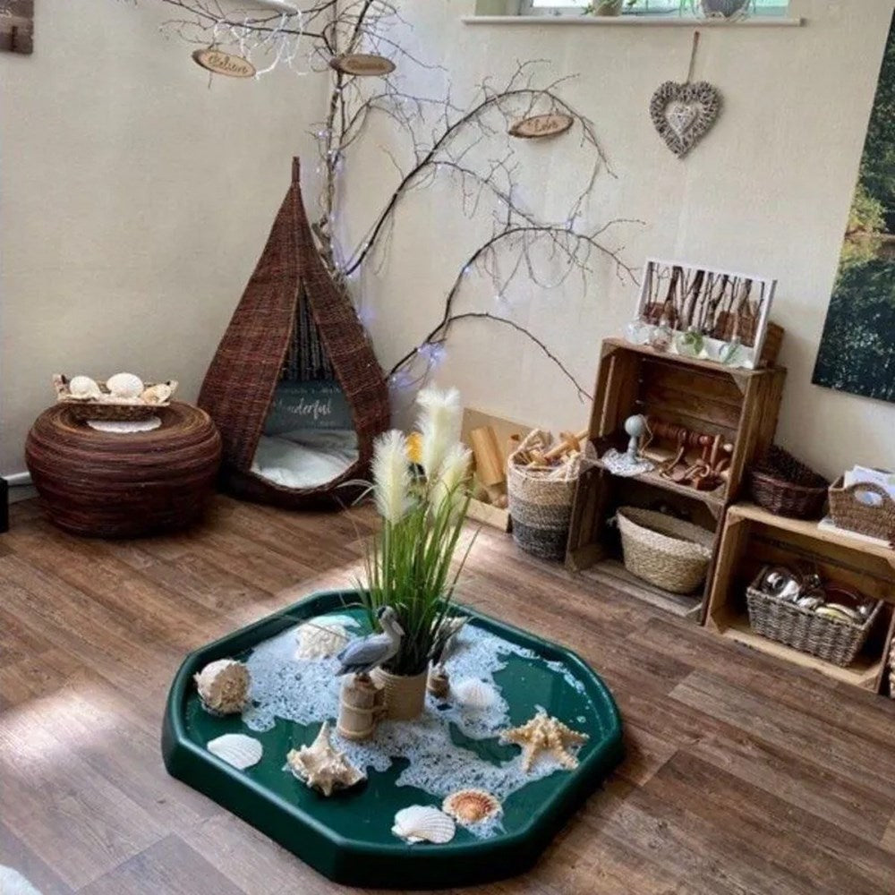 - Wicker pod: The pod gives children a space to sit or lie in whilst engaging in creative activities such as reading or pretend play.