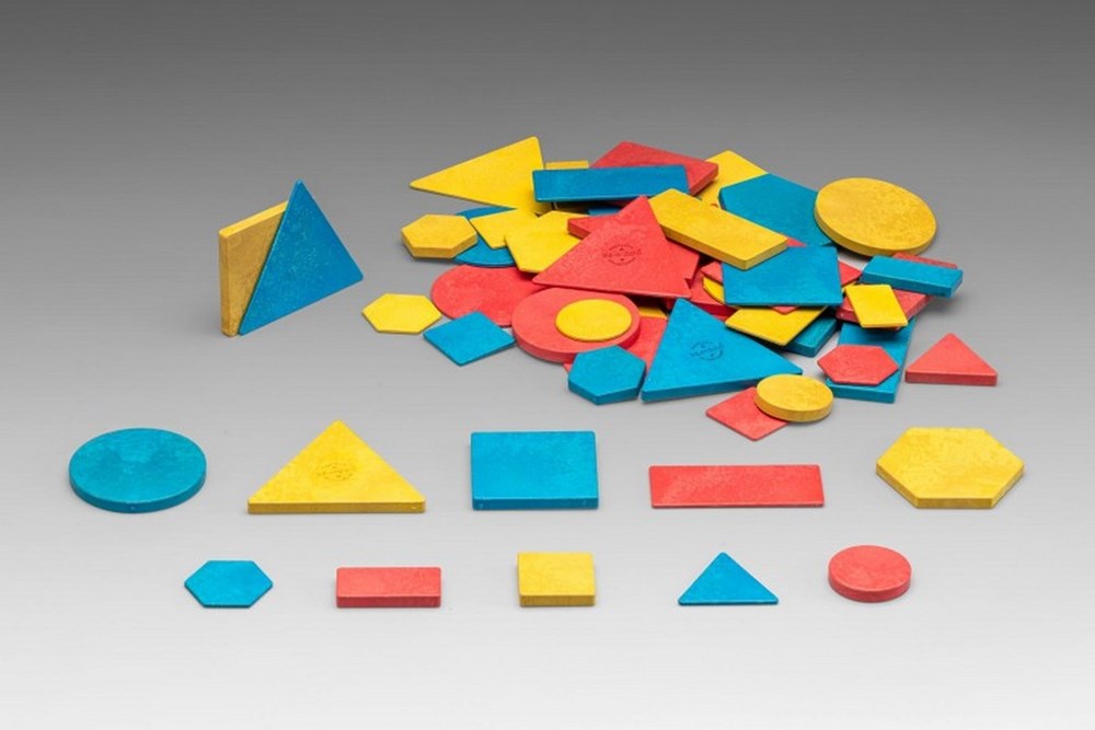 5 different shapes (square, triangle, rectangle, circle and hexagon) in 2 sizes (large square 5.5 x 5.5cm / small square 3.2 x 3.2 cm), in 3 colours (red, yellow and blue) and in 2 thicknesses (0.2 cm and 0.6 cm).